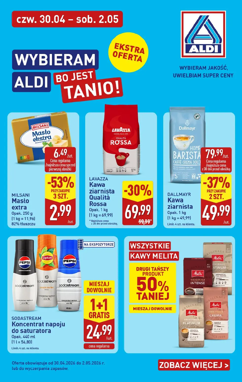 Gazetka ALDI obowiązująca od 30 kwietnia do 2 maja 2026 roku to źródło najlepszych okazji do zaoszczędzenia na codziennych zakupach. Gazetka ALDI dostępna w portalu Moja Gazetka prezentuje eksklusywne promocje i super ceny na wybrane produkty spożywcze oraz artykuły gospodarstwa domowego.