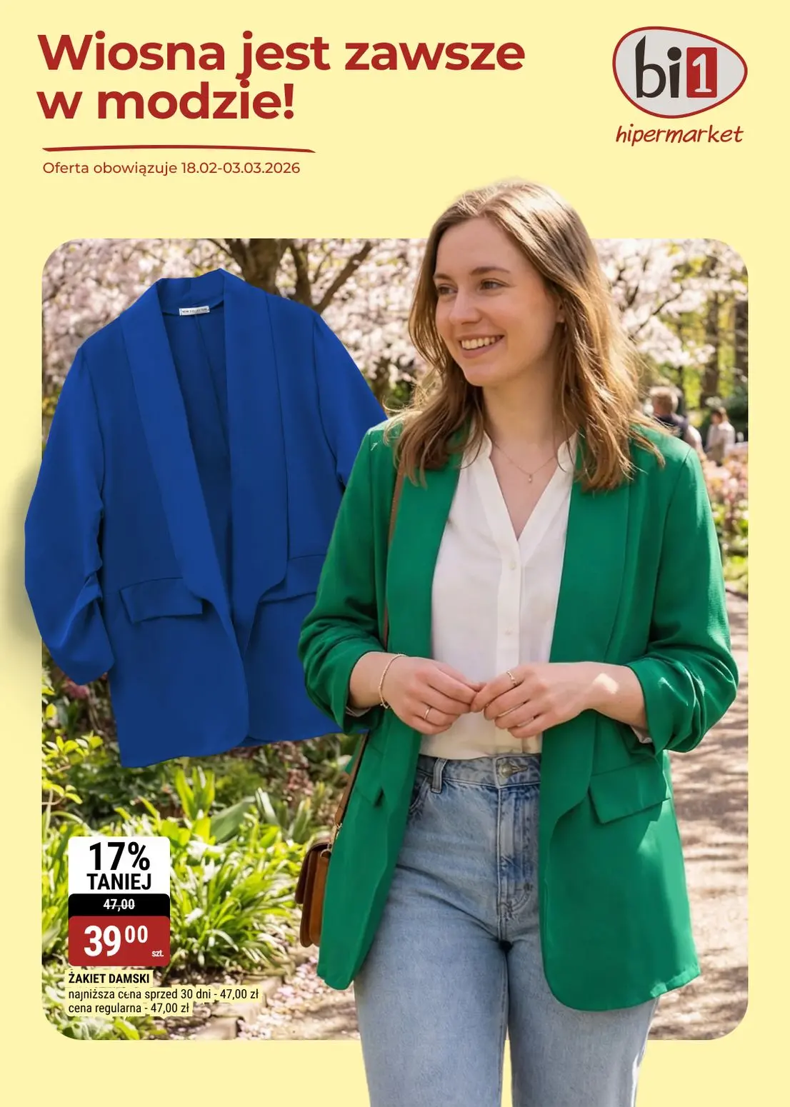 Odkryj wiosenną kolekcję w gazetce bi1 hypermarket dostępnej w aplikacji Moja Gazetka. Gazetka bi1 zawiera najlepsze oferty na odzież wiosenną od 18 lutego do 3 marca 2026. Wśród promocji znajdziesz eleganckie zakiety damskie w modnych kolorach - zielonym i niebieskim - dostępne w atrakcyjnej cenie 39 złotych zamiast 47 złotych. To idealna okazja do odświeżenia swojej garderoby na wiosnę z rabatem 17 procent. Gazetka bi1 hypermarket to źródło najnowszych trendów mody na sezon wiosenny. Przeglądaj gazetka bi1 w portalu Moja Gazetka i planuj swoje zakupy z wyprzedzeniem. Znajdziesz tam spodnie, kurtki, bluzki i wiele innych modnych ubrań na wiosnę w konkurencyjnych cenach. Korzystaj z gazetki bi1 dostępnej online w aplikacji Moja Gazetka i nie przegap żadnej promocji. Wiosna jest zawsze w modzie, a bi1 hypermarket gwarantuje najlepsze wybory ubrań wiosennych dla całej rodziny. Sprawdź aktualną gazetka bi1 hypermarket w Mojej Gazetce i ciesz się zakupami z oszczędnościami na ulubione marki i produkty.