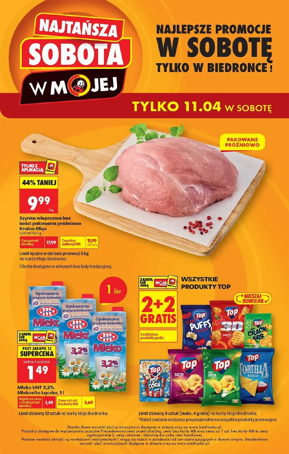 W sobotę 11 kwietnia skorzystaj z najlepszych promocji w Biedronce. Gazetka Biedronce oferuje szyny wieprzowe bez kości pakowane próżniowo marki Kraina Mięs za zaledwie 9.99 złotych za kilogram, czyli aż 44 procent taniej. To idealna okazja dla miłośników wysokiej jakości mięsa.