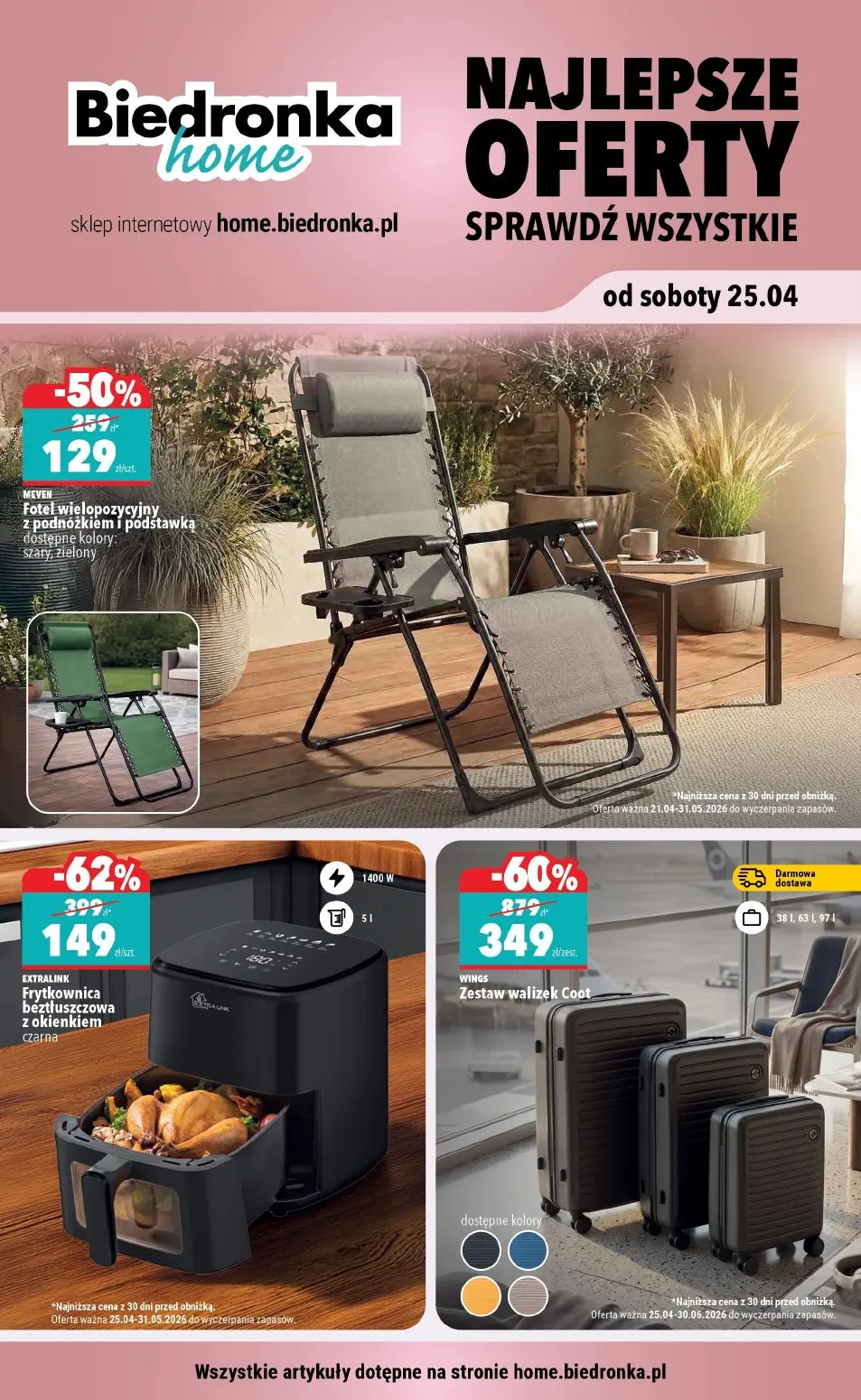Gazetka Biedronka Home to kompletny katalog najlepszych ofert na artykuły dla domu i ogrodu. Gazetka promocyjna Biedronka zawiera spektakularne rabaty do 62 procent na meble ogrodowe, elektronikę domową i akcesoria. Najlepsze promocje w gazetce Biedronka Home obejmują fotel wielopozycyjny z podnóżkiem za 129 złotych w promocji 50 procent, frytkownicę beztłuszczową z okienkiem za 149 złotych przy rabacie 62 procent oraz zestaw walizek Coot z darmową dostawą za 349 złotych z rabatem 60 procent. Gazetka Biedronka Home jest dostępna w aplikacji i portalu Moja Gazetka, gdzie możesz przeglądać wszystkie oferty obowiązujące od soboty 25 kwietnia. Przeceny obejmują również liczne artykuły do wyposażenia wnętrz, meble balkonowe i artykuły turystyczne. Gazetka sklepu Biedronka Home umożliwia zapoznanie się z aktualnymi promocjami dostępnymi również na stronie internetowej home.biedronka.pl. Wszystkie najlepsze artykuły dotępne na stronie home.biedronka.pl są prezentowane w gazetce promocyjnej Moja Gazetka, dzięki czemu zawsze masz dostęp do aktualnych ofert i rabatów na produkty do domu i ogrodu.