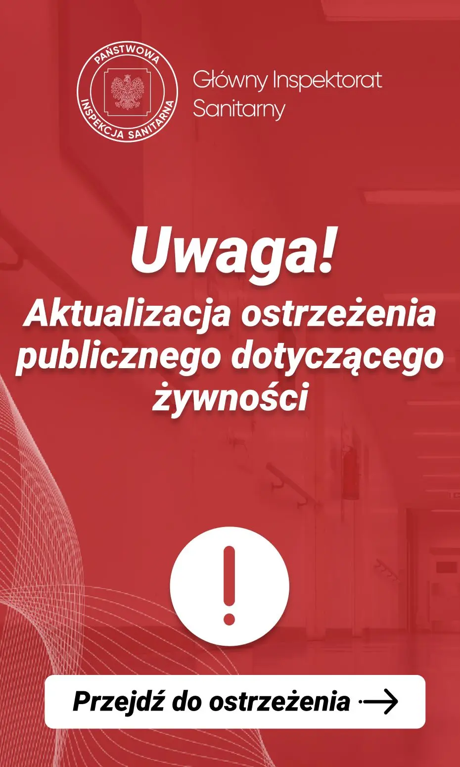 Gazetka Głównego Inspektoratu Sanitarnego - ważne informacje o ostrzeżeniach publicznych dotyczących bezpieczeństwa żywności. Przeczytaj aktualną gazetkę dostępną w aplikacji Moja Gazetka i portalu Moja Gazetka, gdzie znajdziesz wszystkie najnowsze komunikaty oraz ostrzeżenia wydane przez inspekcję sanitarną. Gazetka Głównego Inspektoratu Sanitarnego zawiera istotne dla konsumentów informacje na temat bezpieczeństwa produktów żywnościowych i zdrowia publicznego. Przeglądaj gazetkę regularnie, aby być na bieżąco z najnowszymi ostrzeżeniami i rekomendacjami. Portal Moja Gazetka umożliwia szybki dostęp do wszystkich wydań gazetki promocyjnej oraz informacyjnej. Pobierz gazetkę w aplikacji Moja Gazetka na swoim urządzeniu mobilnym lub odwiedź portal, aby zapoznać się z aktualnym wydaniem. Gazetka dostępna jest bezpłatnie dla wszystkich użytkowników Mojej Gazetki. Bądź zawsze poinformowany o ważnych sprawach dotyczących żywności i zdrowia dzięki gazetce Głównego Inspektoratu Sanitarnego publikowanej w Mojej Gazetce.
