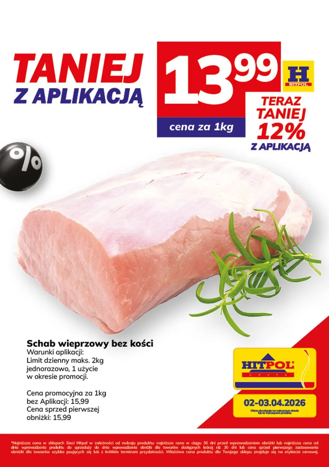 Gazetka Hitpol oferuje wiele atrakcyjnych promocji na artykuły spożywcze i produkty codziennego użytku. Najlepszą ofertą z gazetki jest schab wieprzowy bez kości w cenie 13,99 złotych za kilogram z rabatem 12 procent dla użytkowników aplikacji Moja Gazetka. Przy zakupie przez aplikację cena wynosi 13,99 złotych za kilogram, zaś bez aplikacji 15,99 złotych za kilogram. Promocja obowiązuje w okresie od 2 kwietnia do 3 kwietnia 2026 roku.