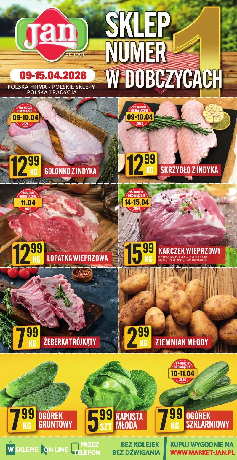 Gazetka Jan zawiera także ofertę warzyw. Ziemniak młody promowany jest za 2,99 zł za kilogram. Ogórek gruntowy i ogórek szklarniowy kosztują po 7,99 zł za kilogram, a promocje obowiązują odpowiednio 10-11 kwietnia i w ostatnie dni kampanii. Kapusta młoda to tańsza alternatywa za 5,99 zł za sztukę.