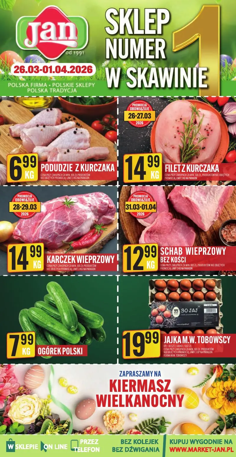 Gazetka Jan - sklep numer 1 w Skawinie. Odkryj najlepsze promocje na mięso, warzywa i artykuły spożywcze od 26 marca do 1 kwietnia 2026 roku. Polska firma z polskimi sklepami i polską tradycją prezentuje wyjątkowe oferty dostępne w Mojej Gazetce.