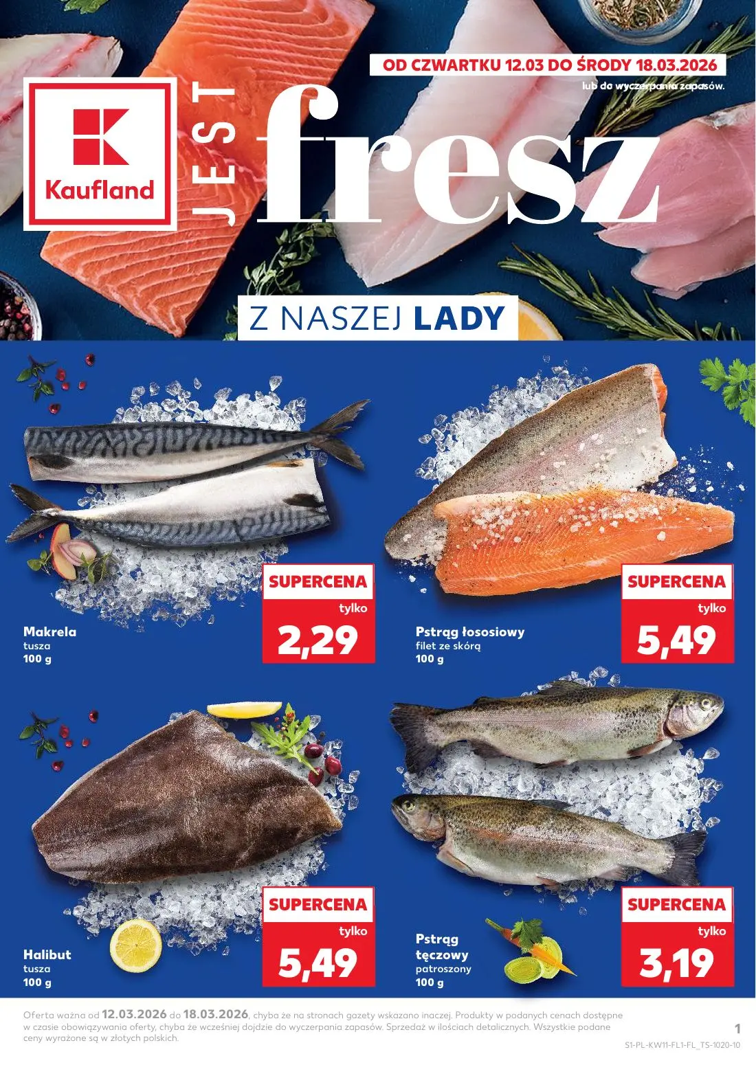 Gazetka Kaufland z promocjami na świeże ryby i owoce morza obowiązuje od 12 marca do 18 marca 2026 roku. Odkryj najlepsze oferty tygodnia dostępne w gazetce Kaufland, którą znajdziesz w aplikacji i portalu Moja Gazetka. Promocje specjalne to makrela tusza za 2,29 zł za 100 g, halibut tusza w cenie 5,49 zł za 100 g oraz pstrąg łososiowy filet ze skórą za 5,49 zł za 100 g. W ofercie znajduje się również pstrąg tęczowy potrzosowany w atrakcyjnej cenie 3,19 zł za 100 g. Wszystkie produkty pochodzą z naszej damy, co gwarantuje świeżość i najwyższą jakość. Gazetka Kaufland zawiera bogatą ofertę produktów spożywczych z etykietą Supercena, dzięki czemu zaoszczędzisz na codziennych zakupach. Pobierz gazetką Kaufland z Mojej Gazetki już teraz i skorzystaj z wyjątkowych promocji na świeże ryby i owoce morza.