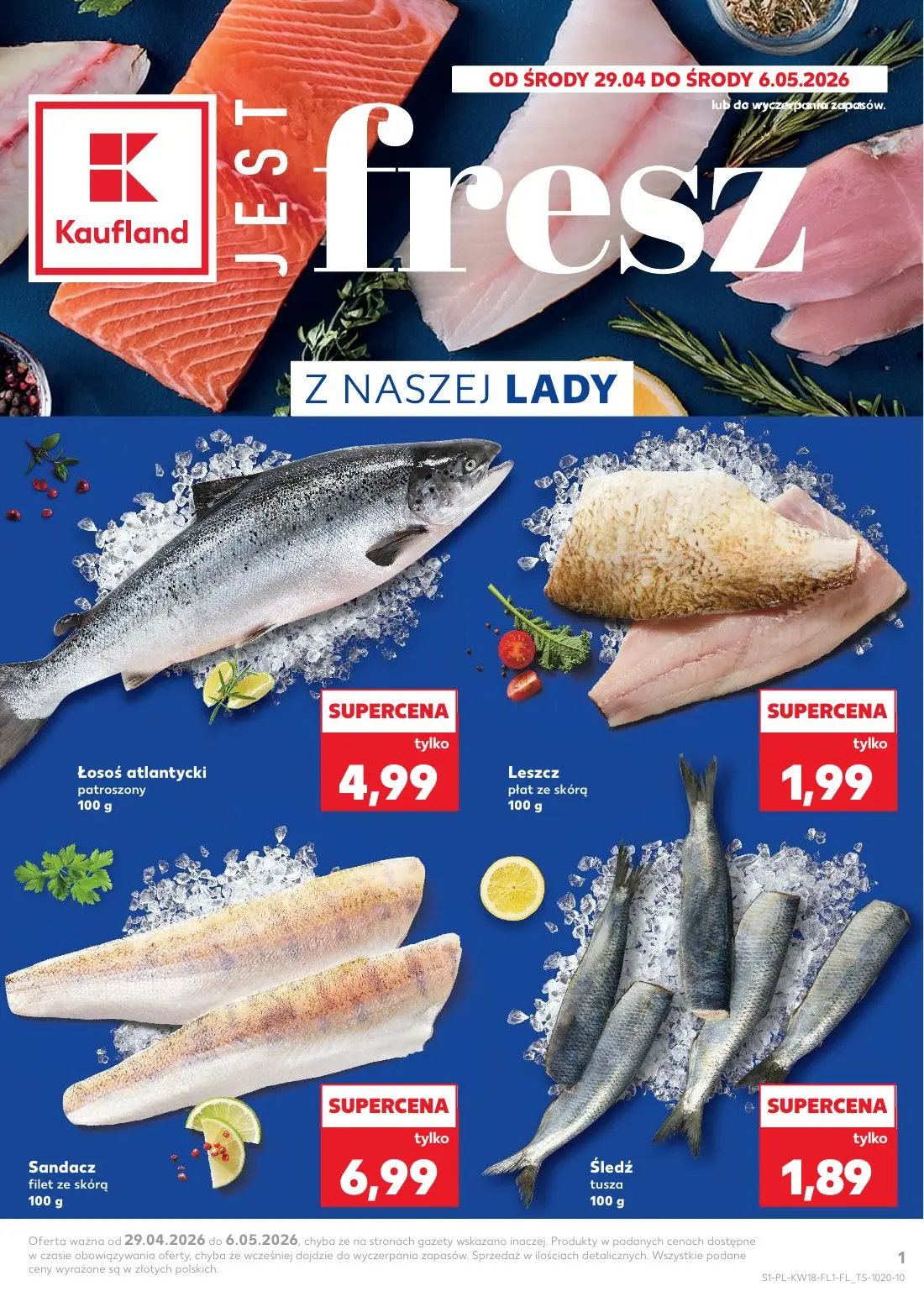 Gazetka Kaufland - Świeże Okazje z Naszej Lady. Promocyjna gazetka sklepu Kaufland dostępna w portalu i aplikacji Moja Gazetka, obowiązująca od 29 kwietnia do 6 maja 2026. Gazetka Kaufland prezentuje wyjątkowe oferty na świeże ryby i owoce morza. Najlepsze promocje w gazetce to łosoś atlantycki patroszony za supercenę 4,99 zł za 100 gram, filet z sandacza ze skórką za 6,99 zł za 100 gram, oraz śledź w tuszu za zaledwie 1,89 zł za 100 gram. Dodatkowo w gazetce znaleźć można leszcz ze skórką za 1,99 zł za 100 gram. Wszystkie produkty dostępne w sklepach Kaufland na terenie Polski. Gazetka Kaufland jest dostępna w aplikacji Moja Gazetka, gdzie możesz przeglądać wszystkie aktualne oferty i promocje. Nie przegap okazji do nabycia wysokiej jakości świeżych produktów spożywczych w atrakcyjnych cenach. Gazetka zawiera również informacje o dostępności produktów w poszczególnych sklepach sieci Kaufland.