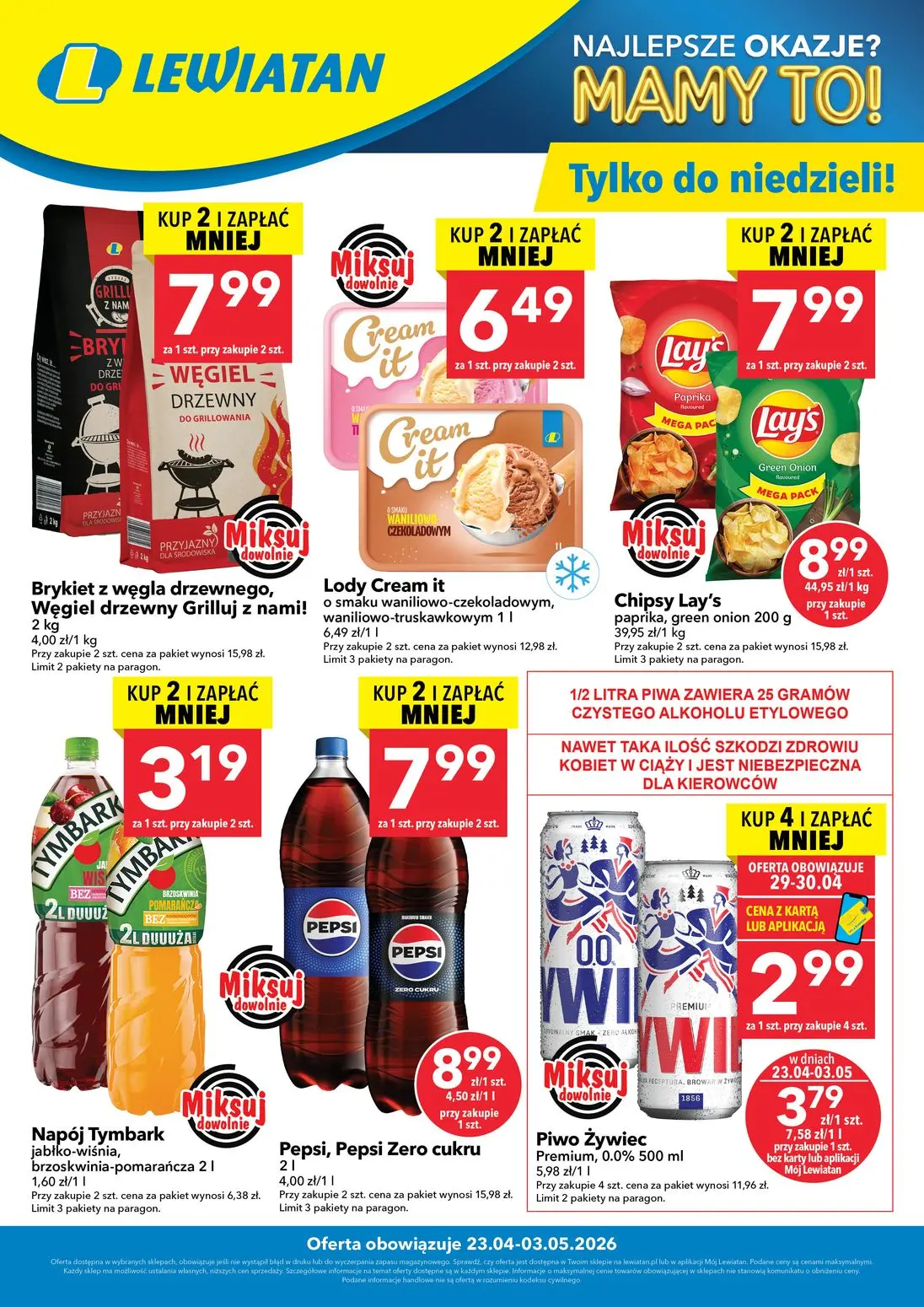 Wśród najlepszych promocji z gazetki Lewiatan znajdziesz brykiet z węgla drewnianego Węgiel drewny Grilluj z nami za 7,99 zł przy zakupie 2 sztuk, lody Cream it o smaku waniliowo-czekoladowym za 6,49 zł oraz chipsy Lay's w rozmiarze mega pack za 7,99 zł. Promocje obejmują także popularne napoje jak Pepsi i Pepsi Zero za 7,99 zł, napój Timbark za 3,19 zł oraz piwo Żywiec Premium 0,0% w cenie 2,99 zł.