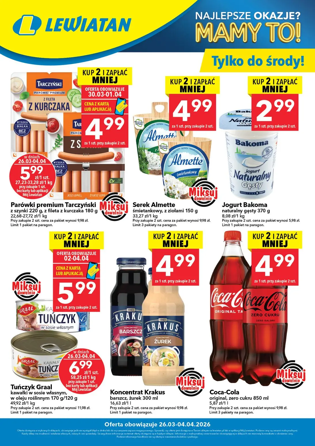 Gazetka promocyjna Lewiatan - najlepsze oferty na artykuły spożywcze i produkty codziennego użytku. Odkryj atrakcyjne promocje dostępne w gazetce Lewiatan od 26.03 do 04.04.2026. Gazetka Lewiatan zawiera szeroki wybór produktów taniej z opcją kup 2 i zapłać mniej. Najlepsze okazje to parowki premium Tarczyński z kurczakiem za 4,99 zł, serek Almette śmietankowy za 4,99 zł, jogurt naturalny Bakoma za 2,99 zł oraz tunczyk Graal w sosie własnym za 6,99 zł. Gazetka promocyjna Lewiatan oferuje także popularne napoje takie jak koncentrat Krakus żurek za 4,99 zł i Coca-Colę zero cukru za 4,99 zł. Przeglądaj gazetka Lewiatan dostępną w aplikacji i portalu Moja Gazetka, gdzie znajdziesz pełny katalog promocji i rabatów. Moja Gazetka pozwala na łatwe przeglądanie ofert handlowych online. Korzystaj z gazetki sklepu Lewiatan na platformie Moja Gazetka i planuj swoje zakupy z wyprzedzeniem. Wszystkie promocje z gazetki Lewiatan są dostępne zarówno w aplikacji Moja Gazetka jak i na portalu Moja Gazetka, umożliwiając wygodne wyszukiwanie najlepszych okazji i porównywanie cen produktów spożywczych oraz artykułów dla całej rodziny.
