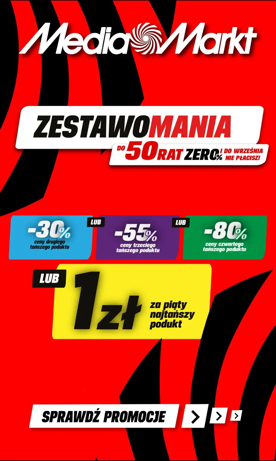 Gazetka Media Markt z promocjami Zestawomania - sprawdź najlepsze oferty w aplikacji Moja Gazetka. Gazetka Media Markt zawiera atrakcyjne rabaty do 50 procent oraz promocje na elektronikę i artykuły gospodarstwa domowego. Wśród najlepszych ofert znajdziesz możliwość obniżki do 30 procent ceny drugiego tanszego produktu, 5 procent zniżki na trzeci najtańszy artykuł oraz aż 80 procent rabatu na czwarty najtańszy towar. Dla wybranych produktów przygotowano specjalną ofertę - zapłacisz zaledwie 1 złoty za piąty najtańszy przedmiot. Promocje dostępne są również w okresie wrzesnia bez dodatkowych warunków płacenia. Gazetka Media Markt jest dostępna w portalu i aplikacji Moja Gazetka, gdzie możesz przeglądać wszystkie aktualne oferty i promocje. Pobierz gazetę Media Markt już teraz w Mojej Gazetce i ciesz się niesamowitymi rabatami na sprzęt elektroniczny oraz artykuły do domu. Sprawdź szczegółowe zasady promocji Zestawomania w gazetce dostępnej w aplikacji Moja Gazetka.