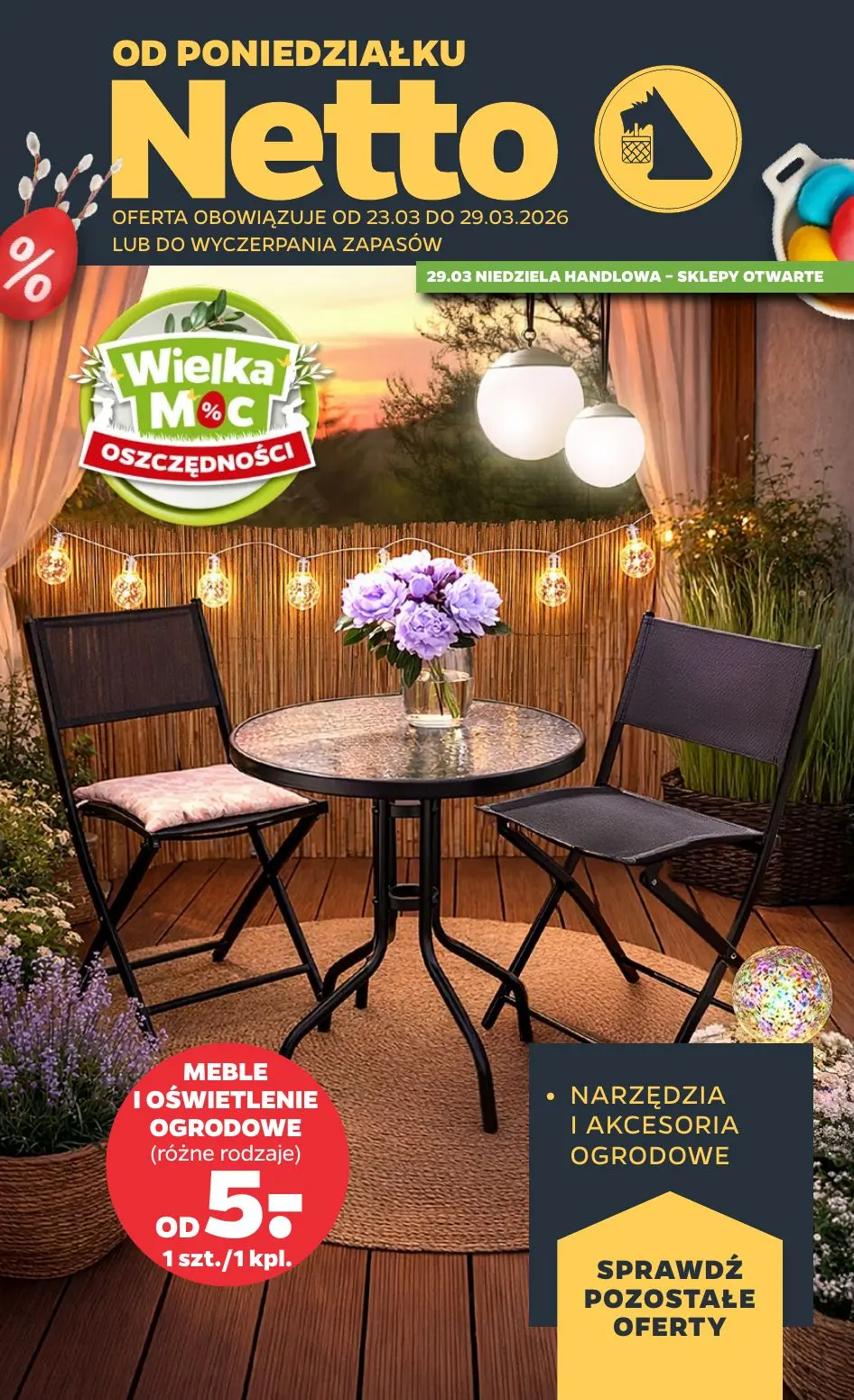 Odkryj niesamowitą ofertę gazetki Netto dostępnej w portalu Moja Gazetka! Gazetka Netto obowiązuje od 23 marca do 29 marca 2026 roku lub do wyczerpania zapasów. To idealna okazja do zakupu mebli i oświetlenia ogrodowego w niskiej cenie. Gazetka Netto w Mojej Gazetce prezentuje fantastyczne promocje na meble i akcesoria ogrodowe, które uatrakcyjnią każdy ogród czy taras. W ramach akcji Wielka Moc Oszczędności otrzymasz meble i oświetlenie ogrodowe już od pięciu złotych za sztukę lub komplet. Najlepsze promocje z gazetki Netto to przede wszystkim składane fotele ogrodowe oraz stylowy okrągły stolik do ogrodu, które dostępne są w atrakcyjnych cenach. Dodatkowo gazetka promuje szeroki wybór narzędzi i akcesoriów ogrodowych, dzięki czemu możesz w pełni wyposażyć swoje miejsce wypoczynku. Niezbiędne oświetlenie ogrodowe oraz praktyczne meble ogrodowe różnych rodzajów czekają na Ciebie w ofercie Netto. Nie przegap okazji zakupów promocyjnych dostępnych wyłącznie w Mojej Gazetce, gdzie znajdziesz wszystkie najnowsze oferty sklepu Netto. Pobierz gazetki Netto i inne promocje handlowych sieci w aplikacji Moja Gazetka, gdzie wygodnie przeglądasz wszystkie dostępne oferty z ulubionych sklepów.