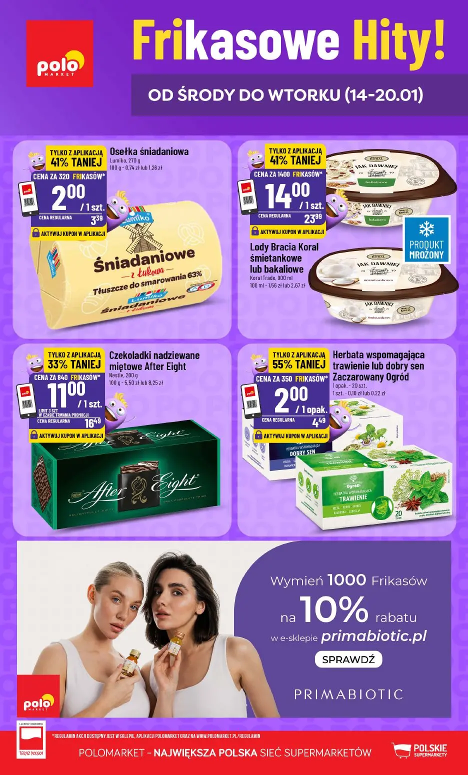 Gazetka Polomarkt Frikasowe Hity to promocyjna oferta dostępna w aplikacji i portalu Moja Gazetka. Gazetka promocyjna sklepu Polomarkt obowiązuje od 14 do 20 stycznia i zawiera najlepsze frikasy z rabatami do 55 procent. Wśród najlepszych promocji gazetki Polomarkt znajdują się: Ośćęka śniadaniowa Lumika za 2 złote zamiast 3,39 złote z rabatem 41 procent tylko z aplikacją, Lody Bracia Koral śmietankowe lub bakaliowe za 14 złotych zamiast 23,99 złotych z rabatem 41 procent tylko z aplikacją, Czekoladki nadziewane miodem After Eight za 11 złotych zamiast 16,59 złotych z rabatem 53 procent tylko z aplikacją oraz Herbata wspomagająca trawienie lub dobry sen Zaczarowany Ogród za 2 złote zamiast 4,49 złotych z rabatem 55 procent tylko z aplikacją. Gazetka sklepu Polomarkt dostępna jest w aplikacji Moja Gazetka i na portalu Moja Gazetka. Promocje z gazetki Polomarkt obowiązują tylko z aktywowanymi kuponami w aplikacji Moja Gazetka. Polomarkt to największa polska sieć supermarketów z najlepszymi ofertami i rabatami na produkty spożywcze, słodycze, napoje i artykuły codziennego użytku.