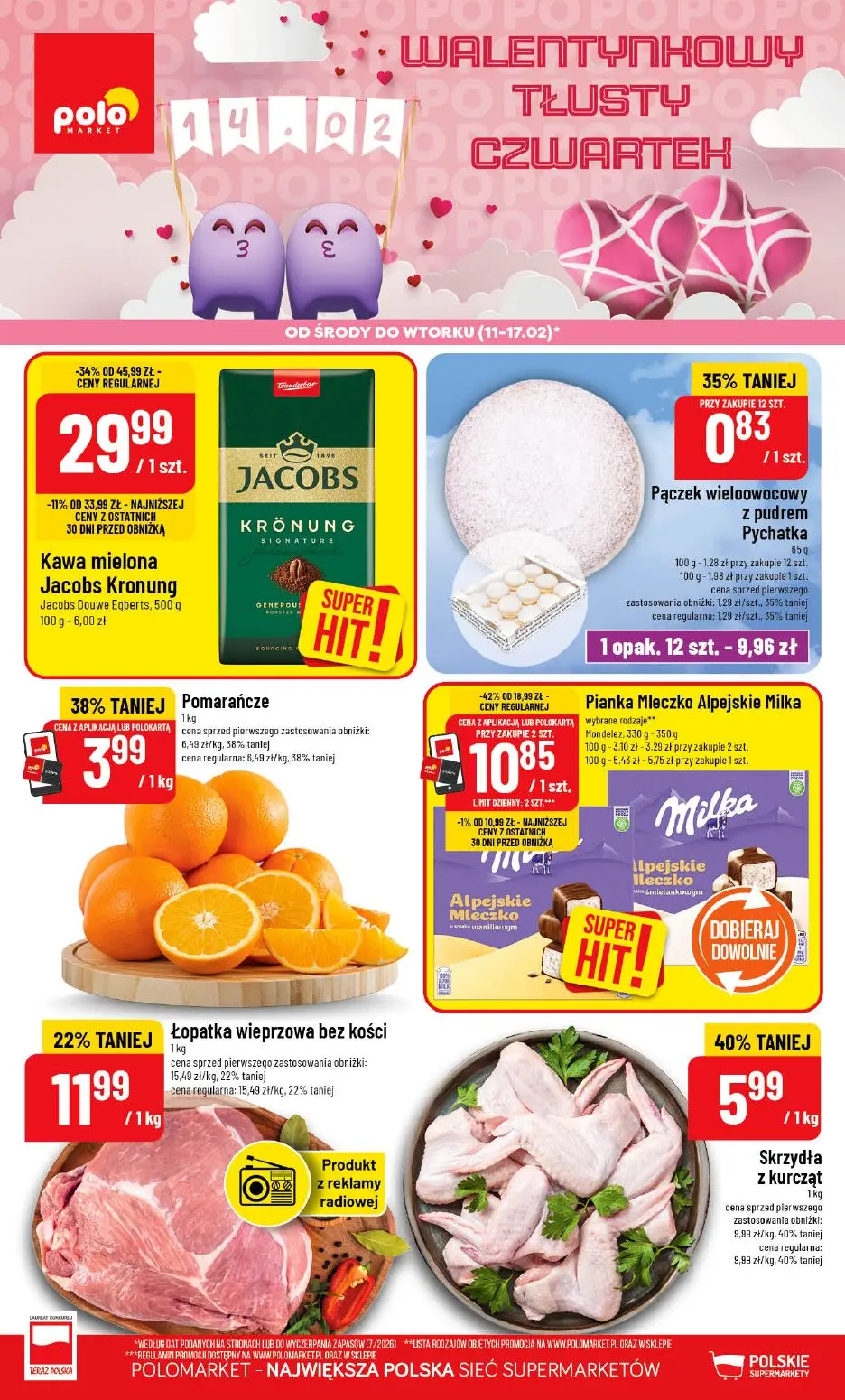 Gazetka Polo Walentynkowa - Thusty Czwartek to oferta promocyjna dostępna w portalu Moja Gazetka, obowiązująca od 11 do 17 lutego 2025 roku. Gazetka Polo przynoszi wiele atrakcyjnych rabatów na popularne produkty spożywcze i artykuły codziennego użytku. Najlepsze promocje z gazetki to kawa mielona Jacobs Kronung za jedyne 29,99 zł za kilogram, paczek wieloowocowy z pudrem Pychatka w cenie 0,83 zł przy zakupie 12 sztuk, oraz pomarańcze w promocyjnej cenie 3,99 zł za kilogram z 38 procentową zniżką. Do znalezionych ofert należy również pianka mleczko alpejskie Milka za 10,85 zł za paczkę oraz skrzydła z kurczaka ze 40 procentowym rabatem za 5,99 zł za kilogram. Łopatka wieprzowa bez kości dostępna jest za 11,99 zł za kilogram ze zniżką 22 procent. Gazetka Polo to idealne źródło informacji o najnowszych promocjach i rabatach w sklepach sieci Polo Market, najpopularniejszej polskiej sieci supermarketów. Gazetka jest dostępna w aplikacji i portalu Moja Gazetka, gdzie można przeglądać wszystkie aktualne oferty promocyjne. Planując zakupy w sklepach Polo, warto zapoznać się z gazetką, aby skorzystać z najlepszych ofert i zaoszczędzić na codziennych zakupach.