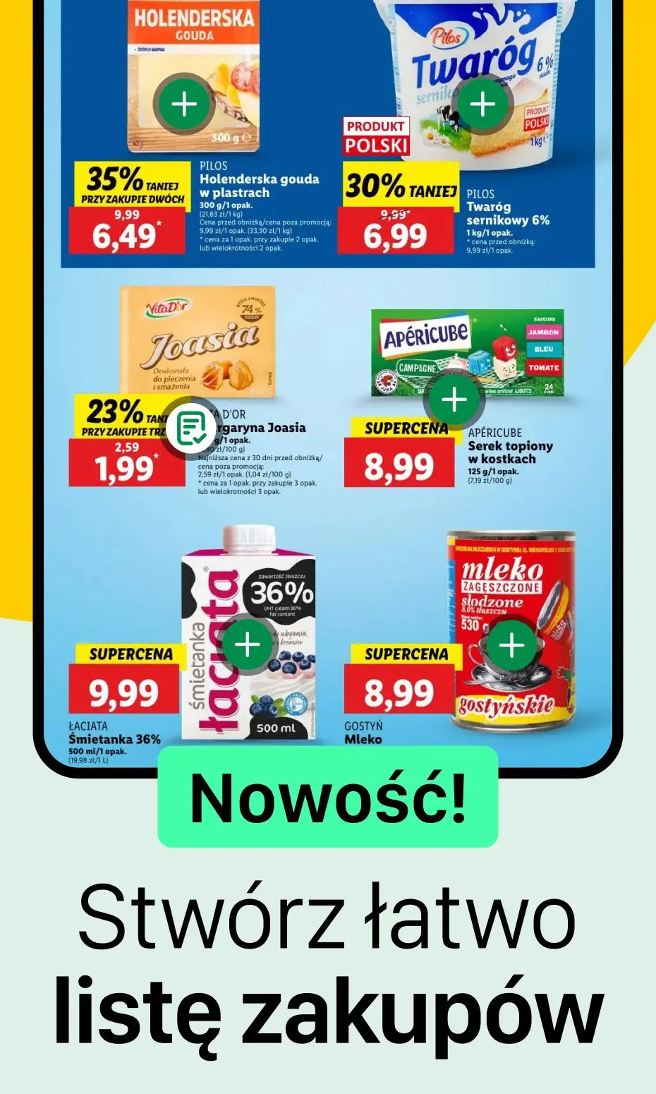 Najnowsza gazetka Lidl dostępna w aplikacji Moja Gazetka! Sprawdź atrakcyjne promocje na produkty nabiałowe. Holenderska gouda 35% taniej przy zakupie dwóch, polski twaróg Pilos 30% taniej. Super ceny na śmietankę Łaciatą 36% i mleko zagęszczone Gostyń. Nie przegap okazji na serek topiony Apéricube i margarynę Joasia. Gazetka Lidl pełna oszczędności - sprawdź teraz w Mojej Gazetce!