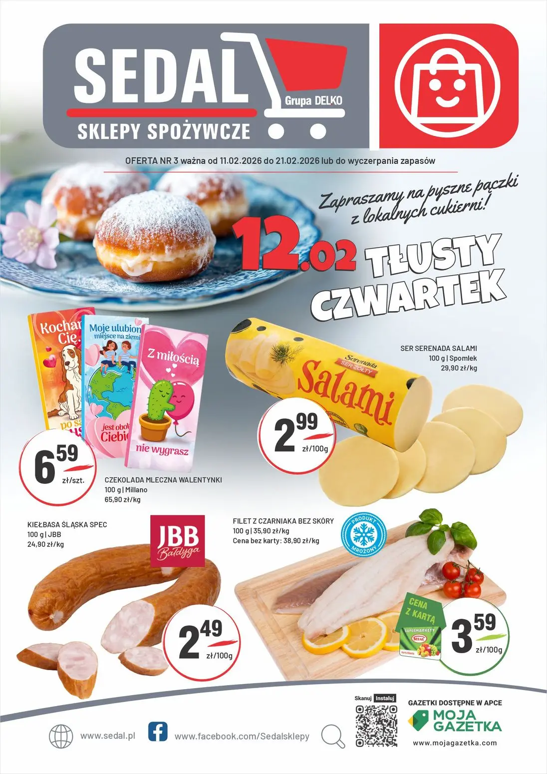 Gazetka SEDAL - najnowsza oferta sklepów spożywczych Grupa DELKO. Dowiedz się o najlepszych promocjach dostępnych od 11.02.2026 do 21.02.2026. Gazetka SEDAL zawiera bogatą ofertę produktów spożywczych w atrakcyjnych cenach. Wśród najlepszych promocji znajdziesz słynne tłuste czwartki z lokalnymi piekarnicami - pączkami w cenie 12,02 zł. Skorzystaj z okazji i kup czekoladę mleczną Valentynki za 6,59 zł za sztukę. Salami cienkostroisty oferowane są w promocji za 2,99 zł za 100 gramów. Kiełbasa śląska spec w promocji kosztuje 2,49 zł za 100 gramów. Filet z czarniaka bez skóry dostępny jest za 3,59 zł za 100 gramów. Ser Serenada Salami w opakowaniu 100 gramów kupisz za 29,80 zł za kilogram. Gazetka SEDAL jest dostępna w aplikacji i portalu Moja Gazetka, gdzie znajdziesz wszystkie bieżące promocje sklepów spożywczych. Pobierz gazetę SEDAL w Mojej Gazetce i oszczędzaj na codziennych zakupach. Gazetka sklepu SEDAL to najlepszy sposób na znalezienie okazji cenowych na artykuły spożywcze. Regularnie przeglądaj gazetę promocyjną SEDAL w Mojej Gazetce i planuj budżet rodzinny z rozsądkiem. Wszystkie oferty są dostępne w wybranych lokalizacjach sklepów sieci Grupa DELKO.