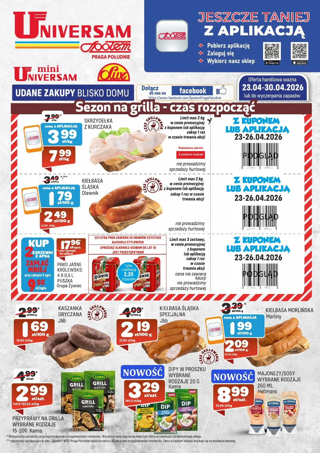 Gazetka Universam Praga Południe - Zobacz najlepsze promocje na grilla i okazje na artykuły spożywcze. Odkryj bieżące oferty handlowe dostępne od 23 do 30 kwietnia 2026 roku. Gazetka Universam jest dostępna w aplikacji i portalu Moja Gazetka, gdzie możesz przeglądać wszystkie promocje i rabaty. W tej edycji gazetki znajdziesz specjalne ceny na mięsa, kiełbasy, piwo i produkty grillowe. Skorzystaj z kuponów promocyjnych dostępnych w aplikacji Moja Gazetka w terminie 23-26 kwietnia 2026. Gazetka sklepu Universam oferuje najlepsze jakości produkty w najniższych cenach. Przejrzyj gazetkę Universam online i zaplanuj swoje zakupy. Wszystkie promocje z gazetki Universam są dostępne w Mojej Gazetce. Pobierz aplikację Moja Gazetka i otrzymuj dostęp do ekskluywnych ofert sklepu Universam. Gazetka zawiera oferty na skrzydełka z kurczaka, kiełbasę śląską, kiełbasę morlińską i wiele innych produktów. Zaloguj się w aplikacji Moja Gazetka, aby śledzić wszystkie nowe promocje i oferty handlowe dostępne w sklepach Universam. Regularne aktualizacje gazetki pozwalają na bieżące śledzenie zmian cen i nowych ofert w Mojej Gazetce.