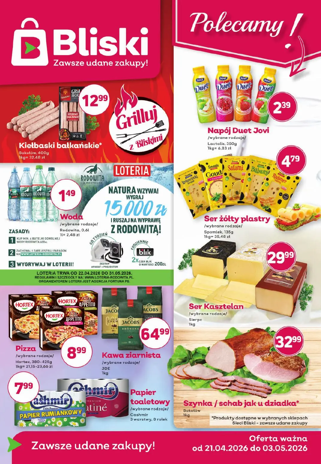Odkryj najlepsze oferty w gazetce Bliski dostępnej w portalu Moja Gazetka! Gazetka Bliski prezentuje szeroki wybór promocji na artykuły spożywcze, napoje i produkty codziennego użytku. W tym tygodniu znajdziesz atrakcyjne ceny na kiełbaski bałkańskie za 12,99 zł, napój Duet Jovi za 2,39 zł oraz wody mineralne Rodewitą za zaledwie 1,49 zł. Promocje obejmują również popularne produkty takie jak kawa ziarnista Jacobs za 64,99 zł, ser Kasztelan za 32,99 zł i sery żółte plastry za 4,79 zł. Nie brakuje także pizzy Hortex za 8,99 zł i papieru toaletowego Cashmir za 7,99 zł. Gazetka Bliski oferuje również możliwość udziału w loterii z Rodewitą z nagrodą główną 15000 złotych. Wszystkie oferty dostępne są od 21 kwietnia do 3 maja 2026 roku. Przeglądaj gazetę Bliski w aplikacji Moja Gazetka i skorzystaj z najlepszych promocji na produkty spożywcze i artykuły gospodarstwa domowego. Gazetka Bliski to gwarancja tanich i udanych zakupów dla całej rodziny.